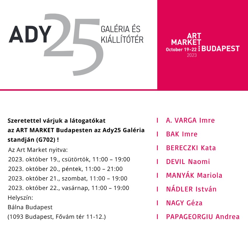 October 19, 2023 - October 22, 2023 Art Market Budapest 2023 Art Market Budapest szerda estétől a Bálnában! Képeimet megtaláljátok az Ady25 Galéria standján (G702), gyertek!